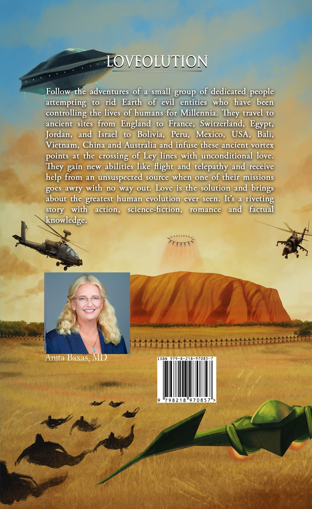 Follow the adventures of a small group of dedicated people attempting to rid Earth of evil entities who have been controlling the lives of humans for Millennia. They travel to ancient sites from England to France, Switzerland, Egypt, Jordan, and Israel to Bolivia, Peru, Mexico, USA, Bali, Vietnam, China and Australia and infuse these ancient vortex points at the crossing of Ley lines with unconditional love. They gain new abilities like flight and telepathy and receive help from an unsuspected source when one of their missions goes awry with no way out. Love is the solution and brings about the greatest human evolution ever seen. It’s a riveting story with action, science-fiction, romance and factual knowledge.